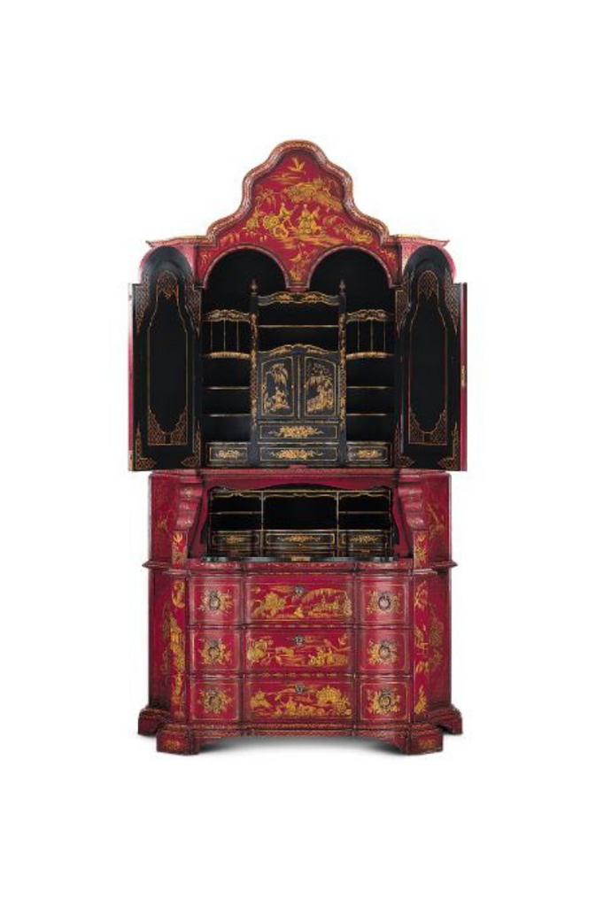 Exquisite Italian Chinoiserie Painted Secretaire, inspired in XVIII Century Italian Secretaire. This piece is hand painted chinoiserie with landscape and scenery on front and sides. It has 2 pieces, the top piece has doors and when open you can find delicate interior made with shelves and small doors, contrasting with the outside. The bottom part has a drop leaf desk opening to a writing surface and shelves and small drawers too. Below the drop leaf has 3 drawers with key. You can order this piece paitned in red on the outside and black on the inside or viceversa.