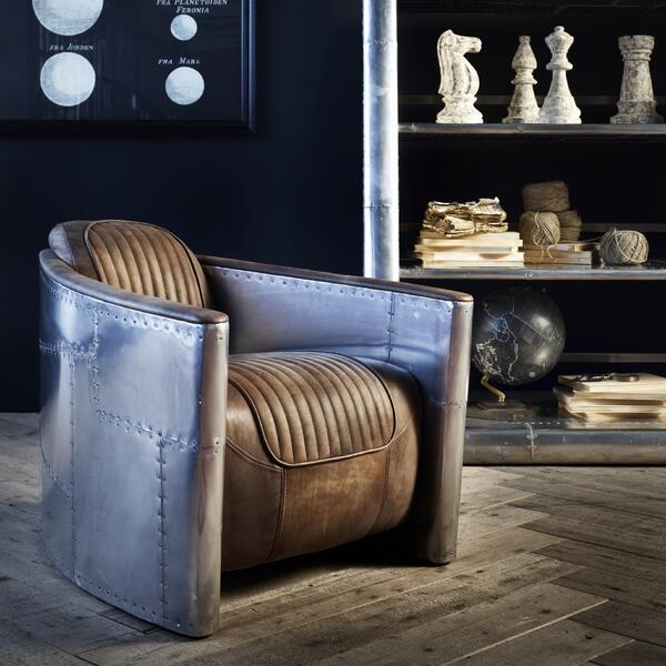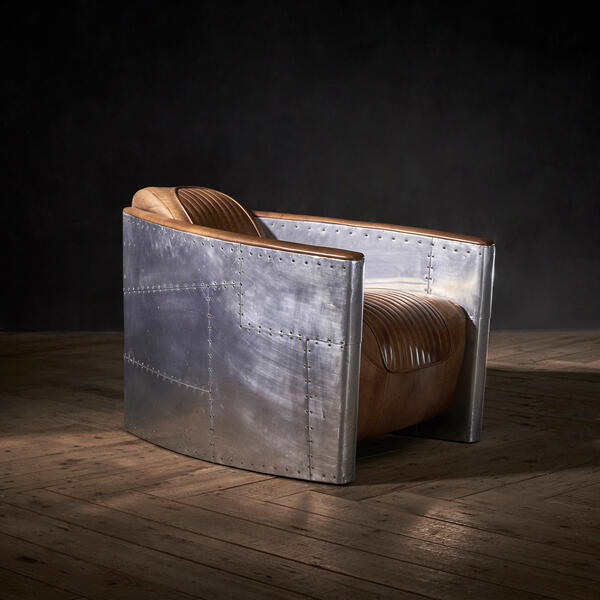 The Aviator Tomcat chair takes its cue from military aviation history, inspired by the twin-cockpit seats of the F-14 Tomcat which was deployed by the U.S. Navy for some of its most prolific missions in the 1970s. The chair's aerodynamic curves are hugged in riveted aluminum, inspired by the World War II British Supermarine Spitfire, put through a five-stage process to distress the metal and create the unique Spitfire finish. The seat and back are swathed in ribbed leather, distressed by hand to emulate the worn-down softness of a vintage bomber jacket. Please note, the Spitfire finish features surface distress variations, which may vary from piece to piece.