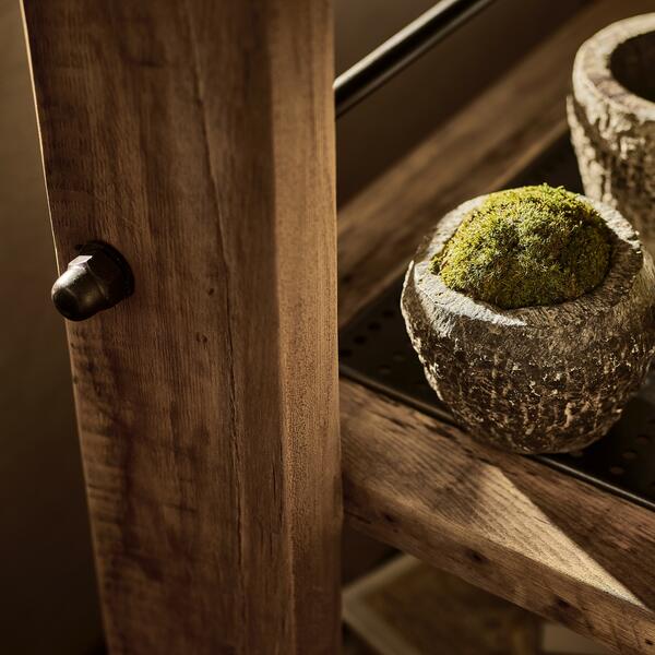 Inspired by the industrious baker's rack. With a rich history dating back to the 17th century, baker's racks were originally used in French bakeries to cool loaves of bread, and later adopted in England. Baker's racks were a common fixture in Victorian kitchens and evolved into functional storage and display pieces for both kitchens and living spaces, infusing a room with heritage, charm, and character. Our Baker's Rack bookcase is handcrafted in chunky planks of reclaimed oak, weathered over a century of use to create a beautiful patina unique to each piece. Iron bars stretch across the back of each shelf and heavy castors give a nod to the original baker's racks, which would have been wheeled from the oven to tempt patrons with delicious, freshly baked fare.