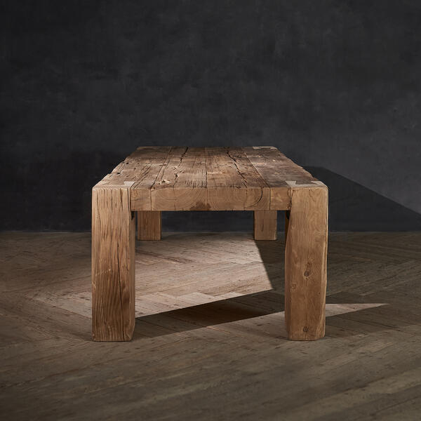 Epic natural beauty, created with aged reclaimed timber. The English Beam dining table is made using old wood up to a century-old, salvaged from the structural beams and pillar joists of buildings across the UK. The arduous process of reclamation starts at a demolition site, where precious sections are recovered. The timbers are sorted and de-nailed by hand, all the while preserving the natural surface, revived to once again support new lifestyles.