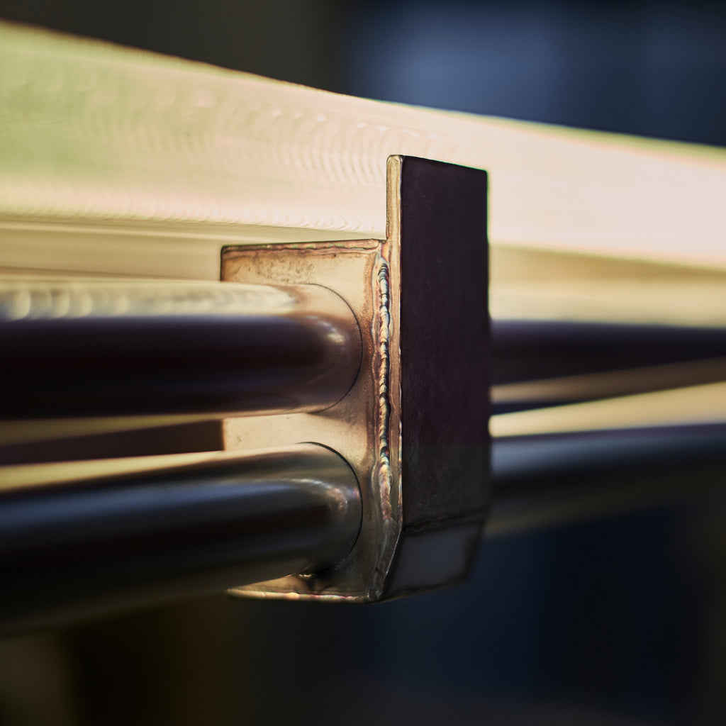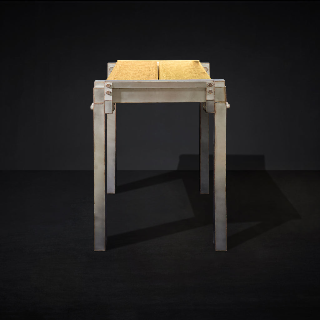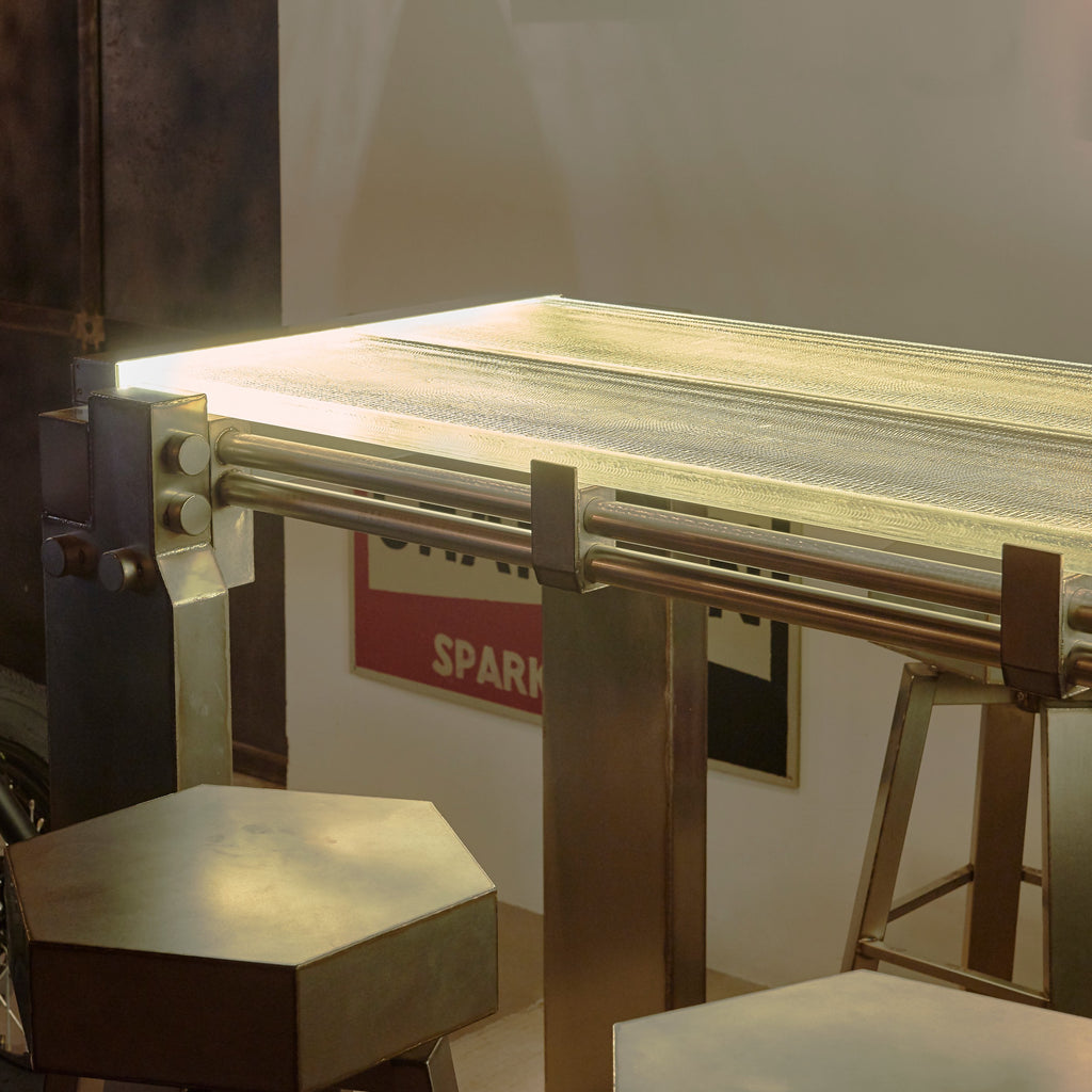 The Flatbed collection takes its inspiration quite literally from the mighty Flatbed trucks, the unsung heroes of the automotive and motorcycling world. These beasts of machines are trucks with an entirely flat, level bed traditionally made of planks, with no sides or roof, allowing cars or motorcycles to be winched onboard for transportation to races, shows, or just to the garage for a tune up. Resonating with the traditional trucks, the Flatbed collection uses Black Ice glass planks to create the surface of each table, contrasted by the intricate stainless steel fabrication work of the frame, embodying the machinery of the trucks, and then highlighted by the internal LEDs to bring each table to life.
