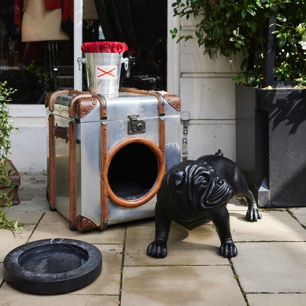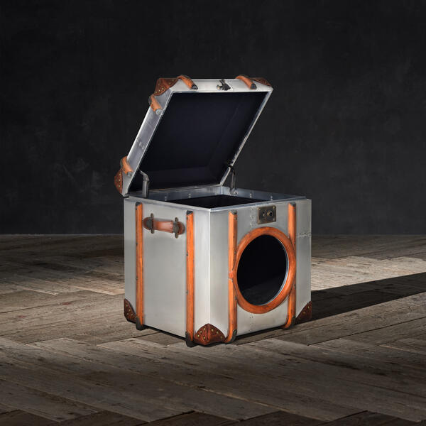 A modern take on vintage travel trunks, the Globetrekker Dog Trunk is handcrafted using traditional methods and is clad in Timothy Oulton's proprietary Spitfire finish, fashioned from riveted, hand-distressed aluminium inspired by the exterior of the famous Supermarine Spitfire fighter plane. Detailing includes oak banding in an antique finish, premium aniline leather corners and handles, and a sprung hinged lid which lifts up to reveal an interior fitted in black canvas, with removable cushion.