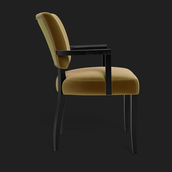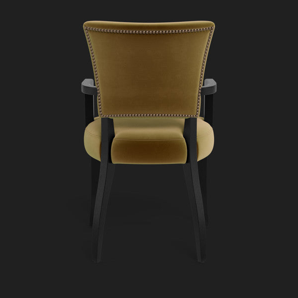 The Mimi dining chair is a reinvention of a classic 1940s French dining chair with brass stud detailing and tapered wooden legs. This luxurious, classic style has a gently flared back and padded seat for comfort so you can chat for hours over dinner with friends. Leather, linen, and Cotton Velvet finishes come with brass studs, Revival Velvet comes with silver studs, and Faded & Degraded and Acid Jungle come with black studs.