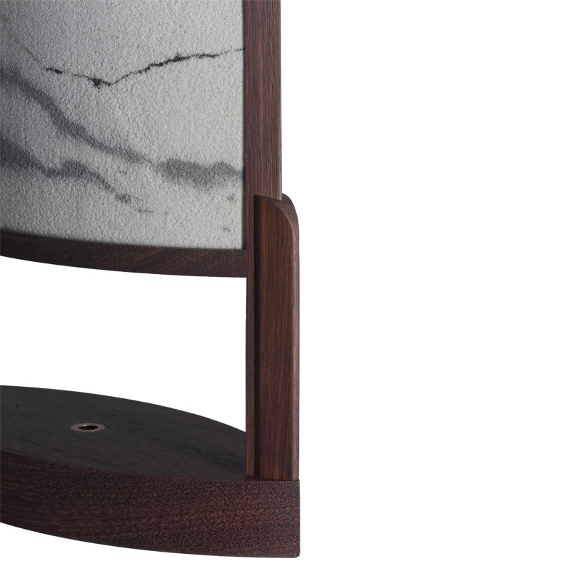 Sucupira wooden frame, translucent natural stone veneer diffuser, warm dimmerable LED strips, movement switch/dimmer, metal elements without finishing.