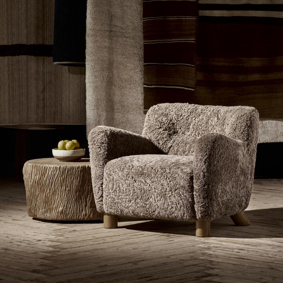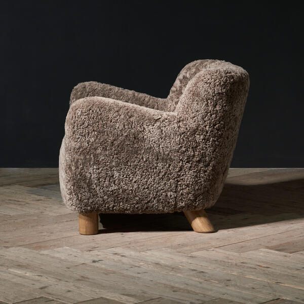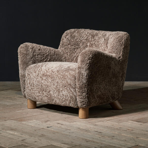 A mid-century modern armchair with a petite silhouette and generous comfort. Upholstered in luxurious sheepskin in a range of finishes teamed with simple weathered oak legs. The name Ryeland references one of England's oldest sheep breeds, bred seven centuries ago by the monks of Leominster in Herefordshire who grazed them on the rye pastures.