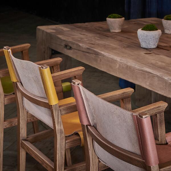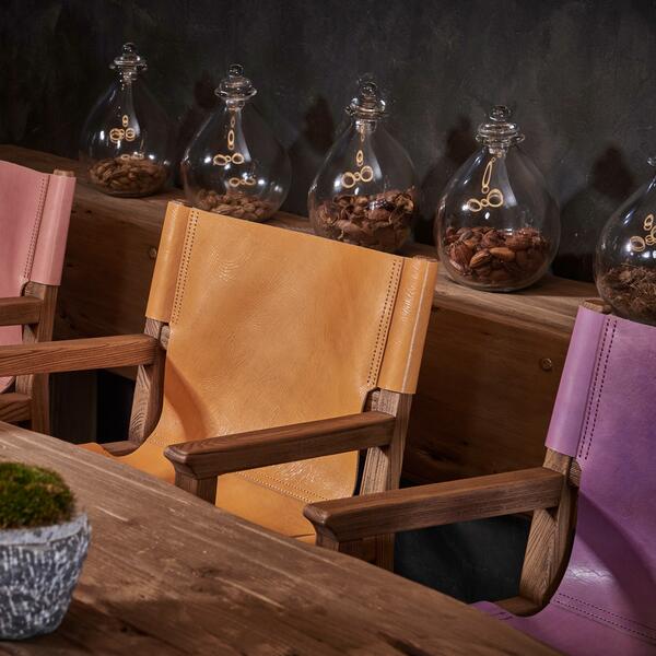 A distressed wooden frame, fashioned from fragments of reclaimed hardwood, slung with a hand dyed and hand-finished aniline leather seat and back. The leather is veg-tanned and veg-dyed to produce a stunning natural colour palette. Also available without arms.