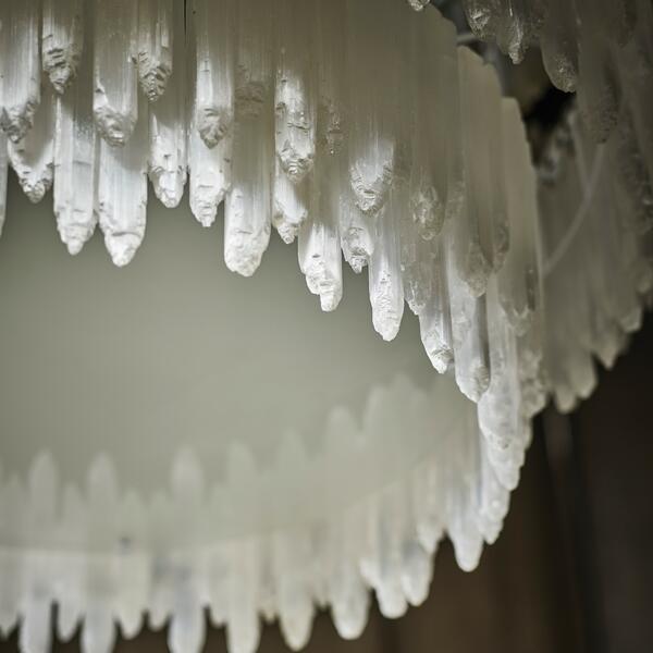A sculpture in its own right, the Selenite Layer pendant is created entirely by hand using shards of natural selenite. Named after the Greek goddess of the moon, selenite is known for its soft pearlescent glow similar to moonlight. It is the crystalline version of the mineral Gypsum and is revered by many for its spiritual and protective properties with some believing it unlocks the chakra of divine wisdom. The oldest Selenite crystal ever discovered was 500,000 years old in Chihuahua, Mexico. Suspended like glistening stalactites, the crystals in our Selenite Layer lighting collection are painstakingly affixed to the frame one by one.