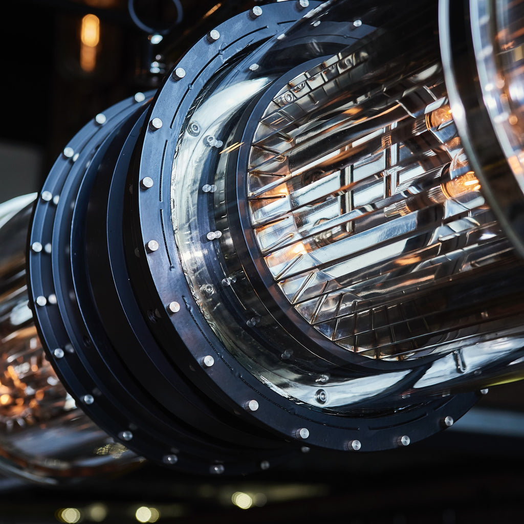 The Turbine rectangular pendant is inspired by intricately crafted turbine engines, which create power by feeding fluid through a rotary assembly to turn the blades. The Turbine pendant has taken many design elements from actual turbine engines, from the blades which encase the bulbs to the solid steel casing which joins the turbine blade units.