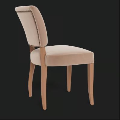 The Mimi dining chair is a reinvention of a classic 1940s French dining chair with stud detailing and tapered wooden legs. This luxurious, classic style has a gently flared back and padded seat for comfort so you can chat for hours over dinner with friends. Leather, linen, and Cotton Velvet finishes come with brass studs, Revival Velvet comes with silver studs, and Faded & Degraded and Acid Jungle come with black studs.