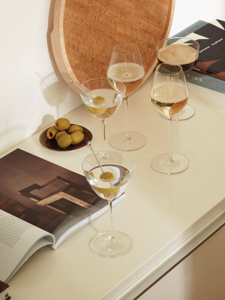 Set of four martini glasses with curved bowls and fine, straight stems. Designed for short cocktails such as Manhattans, Gimlets and Martinis. Made from lead-free crystalline glass for clarity and strength.