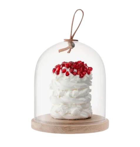 A mouth-blown glass dome on a stand made from sustainablyssourced ash. The dome's natural leather toggle is knotted by hand. Designed for serving a single small cake, biscuits or cheese.