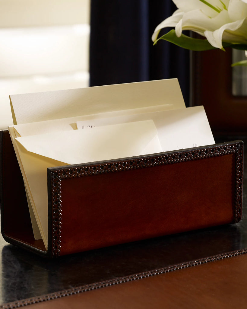 A stylish desk accessory inspired by the refined details found in classic brogue shoes, this handsome letter rack is crafted from soft, hand-burnished leather and features perforated detailing and serrated-edge trim.
