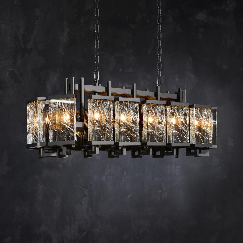 This powerfully bracing design features polished glass that has been uniquely textured by extreme heat to resemble blocks of frozen ice. Each block is lit from behind to accentuate its rugged crystallised swirls, and held in an industrial matt black frame. A formidable conversation piece, to proverbially break the ice with new found friends over dinner.
