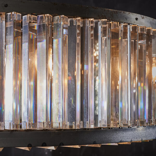 Swirl your senses with the show-stopping Rex collection. Strongly directed by Art Deco influences, Rex recaptures the magic and romance of glamour's golden age.The collection is inspired by the historic Rex cinema in England; a 1930s Art Deco gem boasting a beautiful auditorium with dramatic lighting. Saved from dereliction by a local entrepreneur, the cinema was restored to its former glory in 2004. The Rex pendant juxtaposes its raw iron frame with glowing prisms of optical grade glass, refracting the light in a perpetual dance of shimmer and sparkle. Vintage glamour, recast for today.